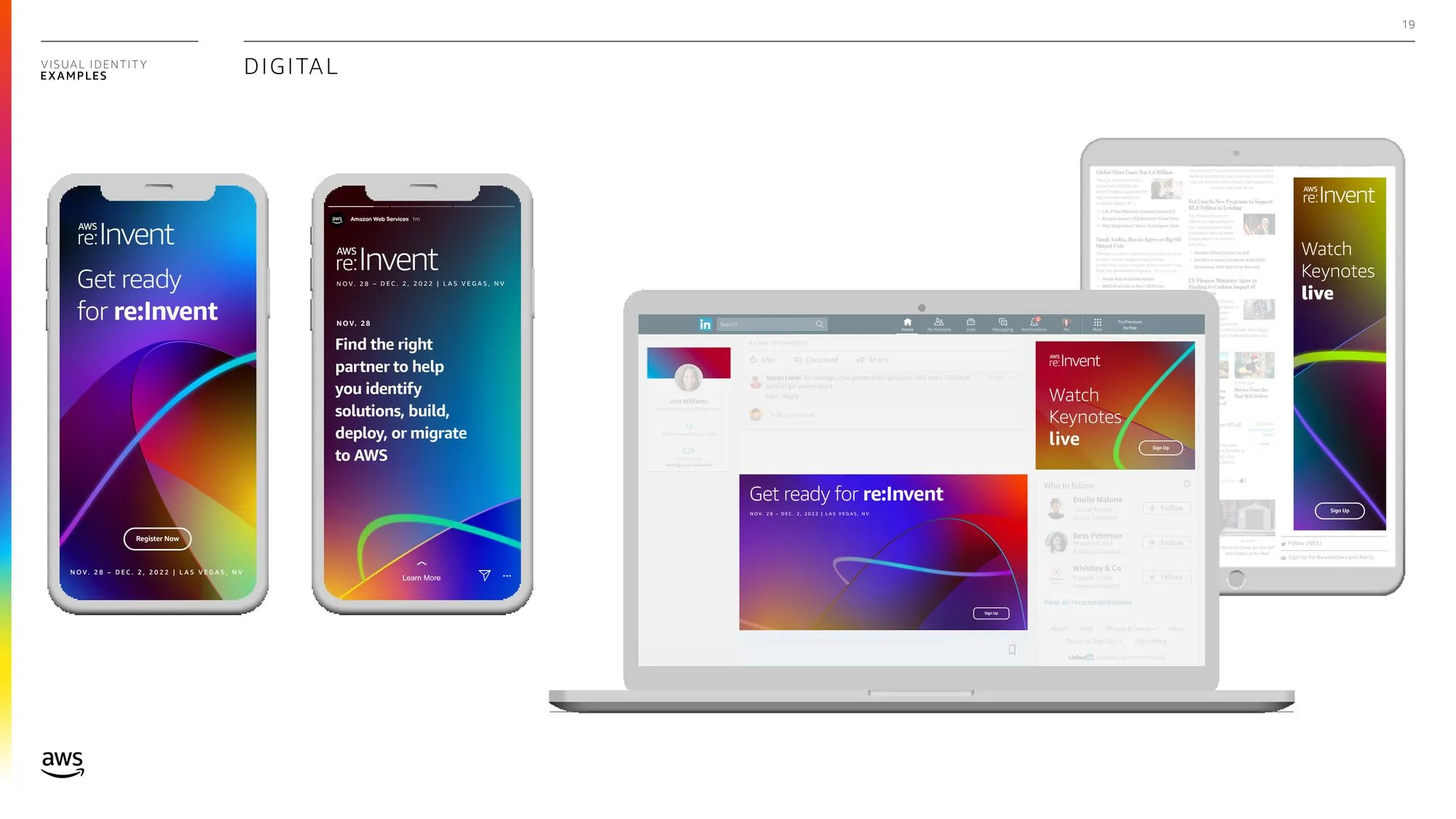 Art-directed visuals and design systems for the world’s largest cloud conference (re:Invent) across 10+ venues—marketing assets, functional signage, SWAG/apparel, web experiences, live presentations, and motion templates. Built cohesive brand guidelines under extreme production timelines, reaching 50K+ global attendees annually.